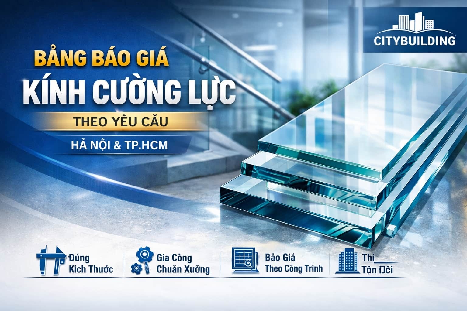 💎 Cập nhật bảng báo giá kính cường lực theo yêu cầu tại Hà Nội và TP.HCM từ Citybuilding. Báo giá theo độ dày kính, loại kính, khối lượng, cấu hình gia công và phương án thi công thực tế, phù hợp nhà ở, showroom, văn phòng và công trình thương mại.