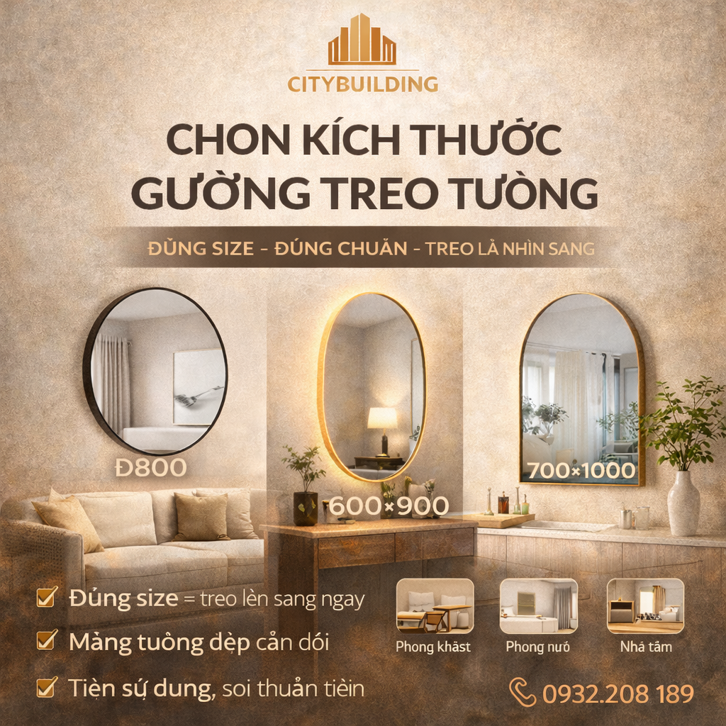 💎 Hướng dẫn chọn kích thước gương treo tường chuẩn đẹp theo từng không gian: phòng khách, phòng ngủ, nhà tắm, hành lang, showroom. Gợi ý size tròn/oval/vòm/freeform, tỷ lệ treo đúng chuẩn. Citybuilding tư vấn – thiết kế – lắp đặt tận nơi TP.HCM & Hà Nội. Hotline 0932208189.