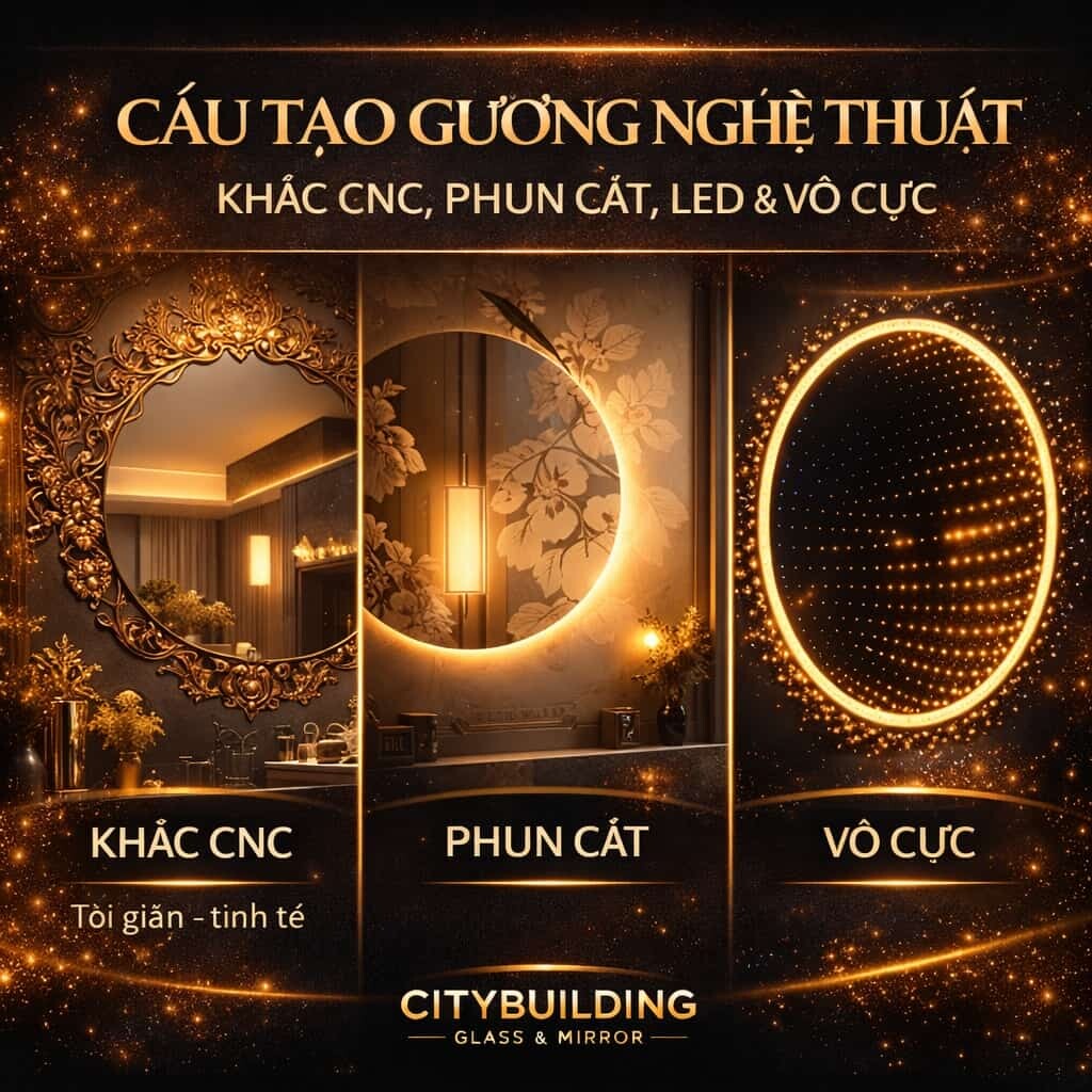 💎 CẤU TẠO GƯƠNG NGHỆ THUẬT: KHẮC CNC, PHUN CÁT, LED & VÔ CỰC
