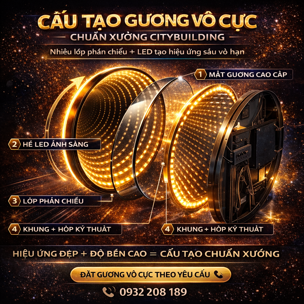 💎 Cấu tạo gương vô cực gồm nhiều lớp phản chiếu kết hợp LED tạo hiệu ứng đường hầm ánh sáng sâu vô hạn. Citybuilding chia sẻ cấu tạo chuẩn xưởng, những điểm quyết định độ sâu – độ mịn – độ bền khi sử dụng lâu dài.