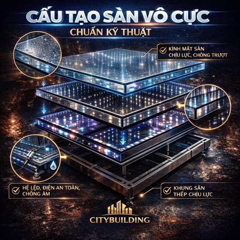 🔹 CẤU TẠO SÀN VÔ CỰC CHUẨN KỸ THUẬT | KÍNH – GƯƠNG – LED – KẾT CẤU CHỊU LỰC