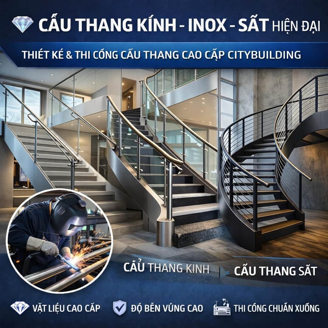 👉 Citybuilding thiết kế, sản xuất và thi công cầu thang kính, cầu thang inox, cầu thang sắt và cầu thang uốn cong cao cấp cho nhà phố, biệt thự, showroom và công trình hiện đại. Giải pháp cầu thang chuẩn xưởng – bền, đẹp, an toàn và đồng bộ thẩm mỹ.