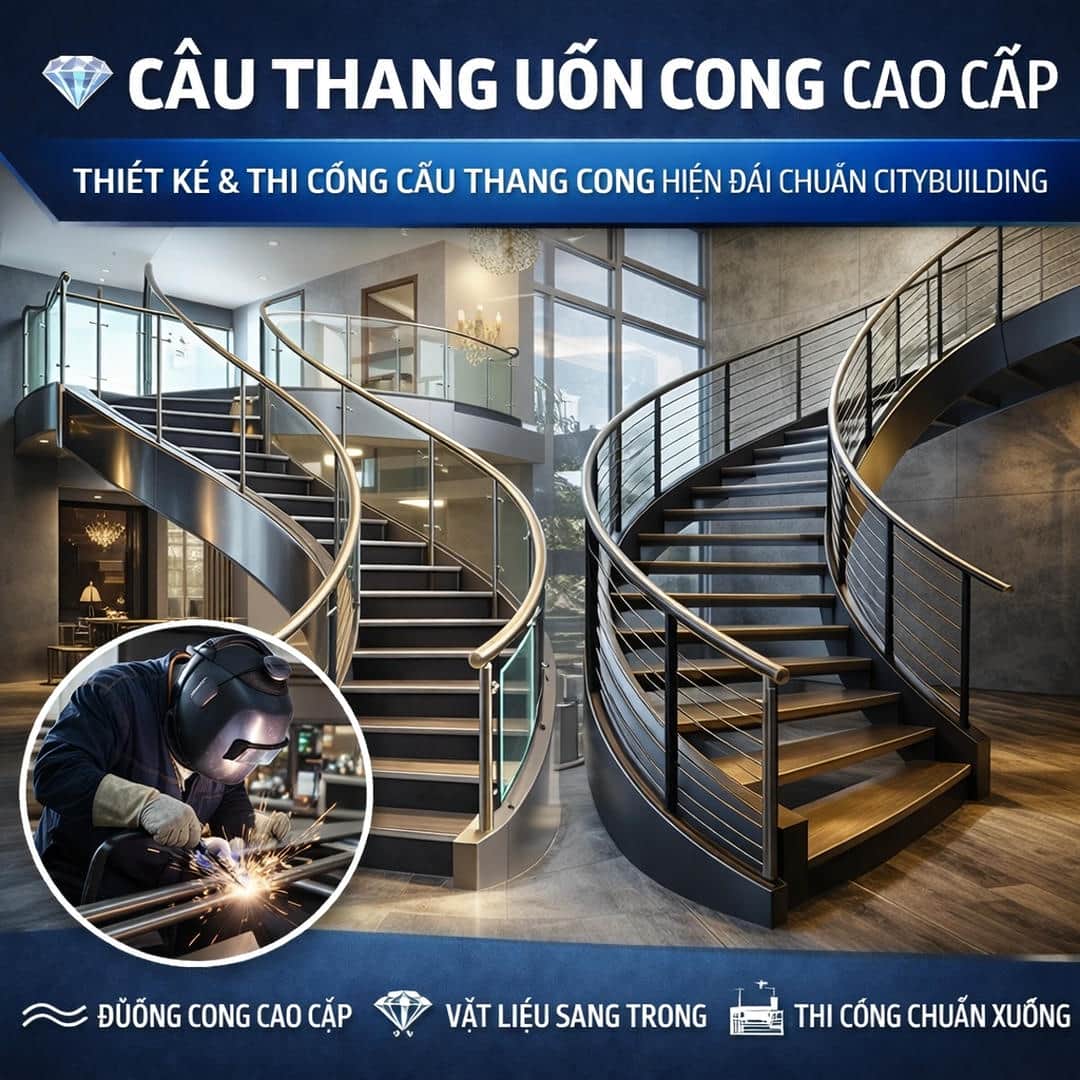 💎 Khám phá mẫu cầu thang uốn cong đẹp, sang trọng, tối ưu thẩm mỹ và công năng cho biệt thự, nhà phố, showroom, khách sạn. Citybuilding nhận thiết kế – sản xuất – thi công cầu thang uốn cong theo yêu cầu với giải pháp sắt, inox, kính và tay vịn đồng bộ.