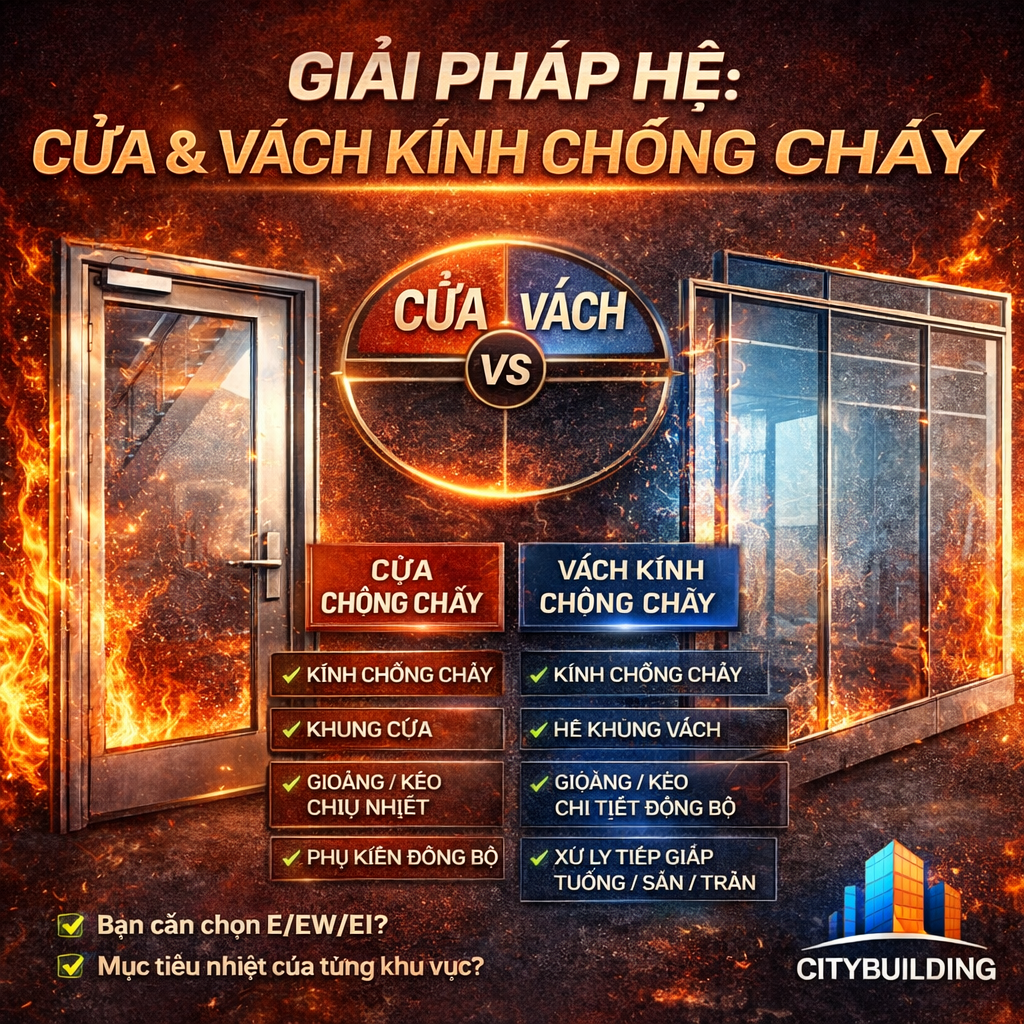 🔹 Cửa kính chống cháy & vách kính chống cháy: Cấu hình hệ, khung – gioăng – phụ kiện đúng chuẩn | Citybuilding