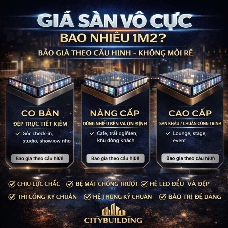💎 Giá sàn vô cực theo m2 phụ thuộc kết cấu chịu lực, bề mặt kính, hệ LED, độ sâu hiệu ứng và mức hoàn thiện. Bài viết giúp bạn hiểu cách tính giá sàn vô cực, các gói cấu hình phổ biến và cách Citybuilding báo giá đúng chuẩn công trình.
