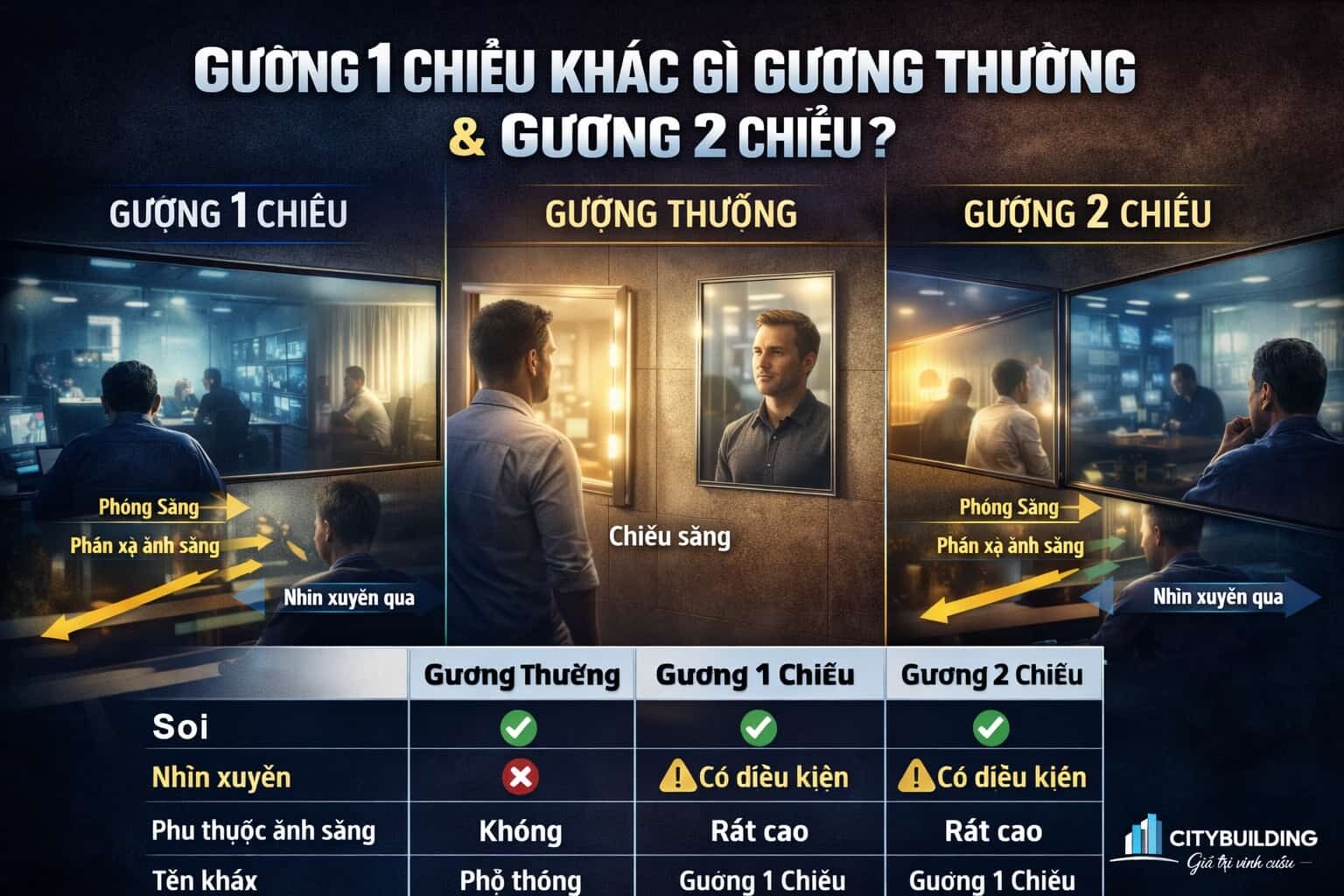 | Tiêu chí | Gương thường | Gương 1 chiều | Gương 2 chiều |