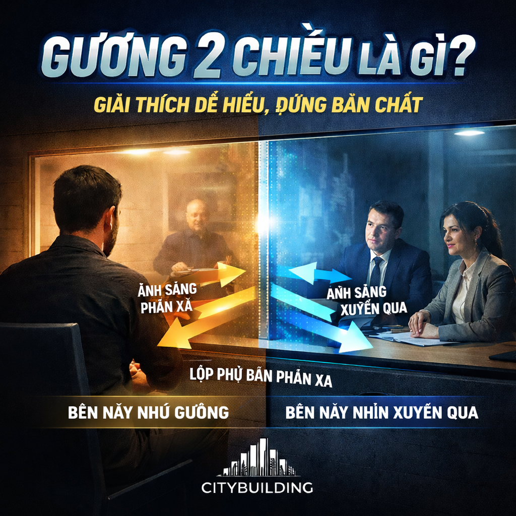 Nói một cách dễ hiểu, gương 2 chiều không phải chỉ phản chiếu, mà còn cho ánh sáng xuyên qua có kiểm soát. Chính sự kết hợp này tạo ra hiệu ứng quan sát “một chiều – hai không gian”.