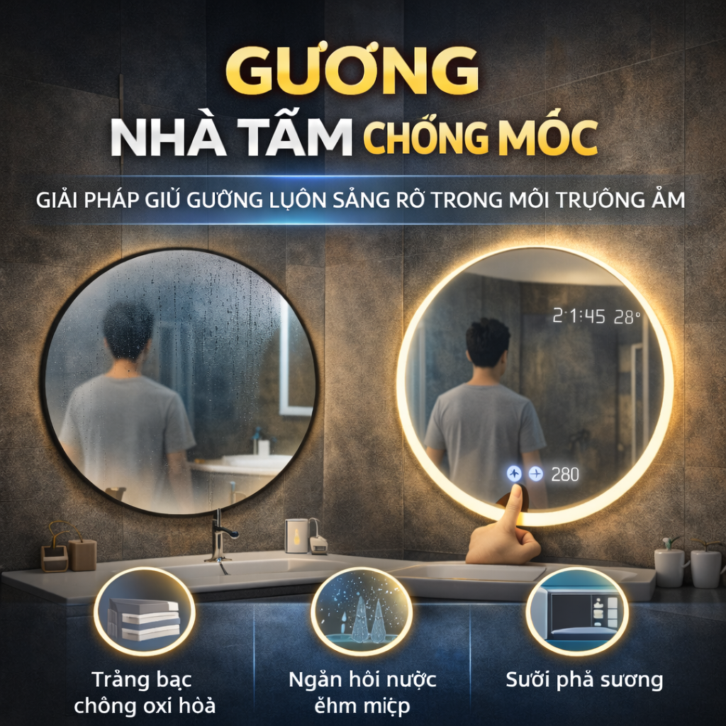 Gương nhà tắm chống mốc là dòng gương được xử lý bằng công nghệ chống ẩm – chống hơi nước – chống oxi hóa, giúp bề mặt gương không bị mờ, đốm đen hay bong tróc khi sử dụng lâu dài trong môi trường phòng tắm ẩm ướt.