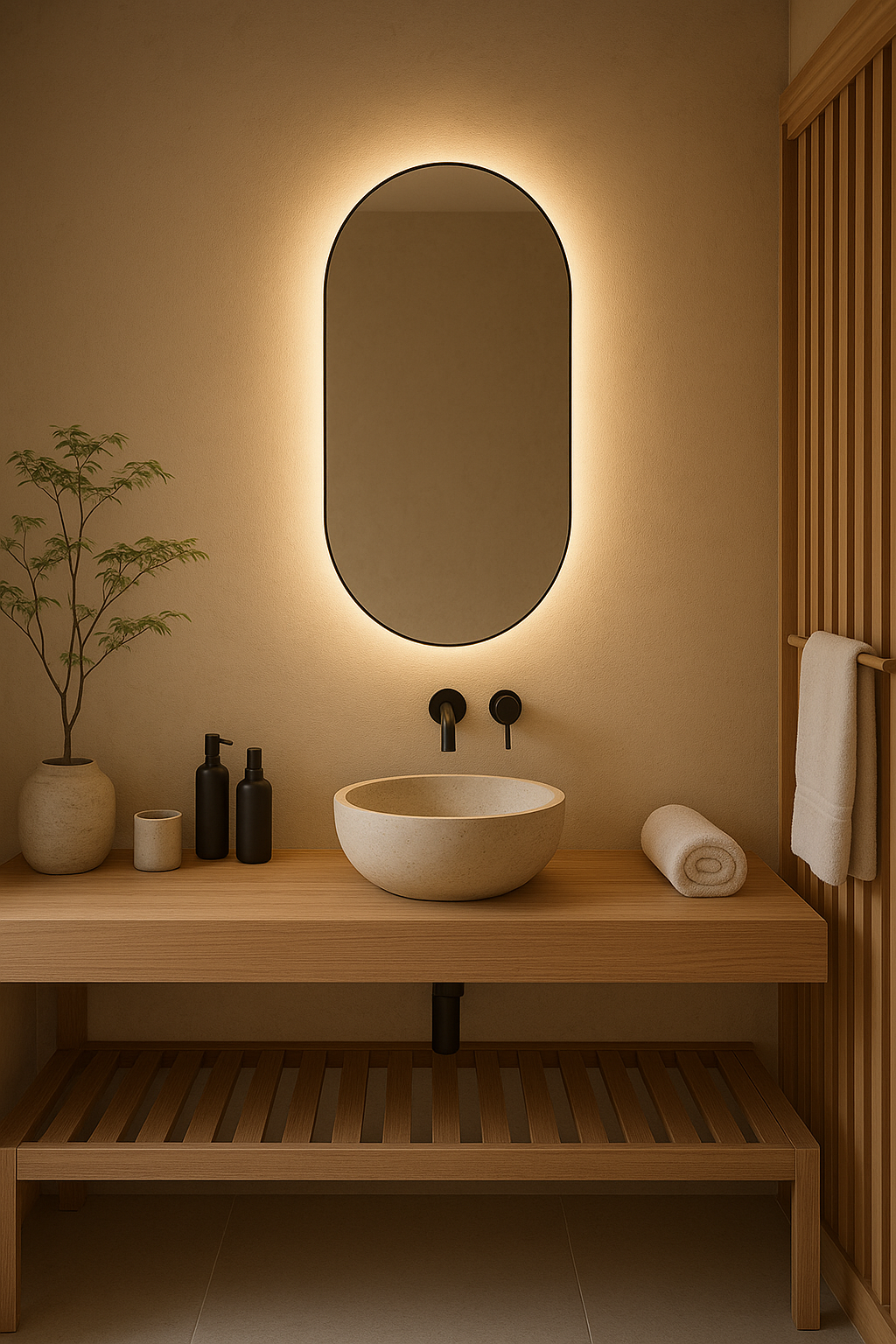 Gương LED hoặc gương bo cong giúp phòng tắm sang trọng như khách sạn 4–5 sao.