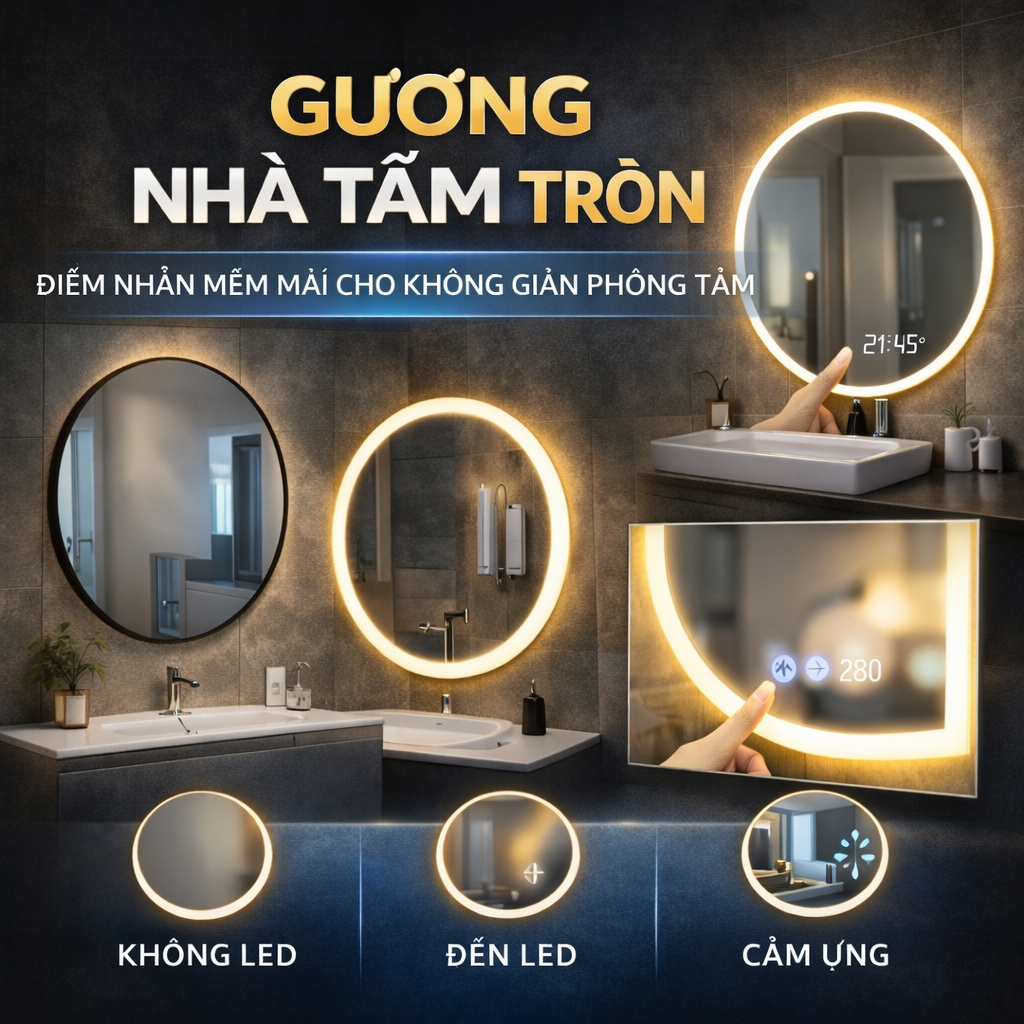 🔹 GƯƠNG NHÀ TẮM TRÒN – ĐIỂM NHẤN MỀM MẠI CHO KHÔNG GIAN PHÒNG TẮM