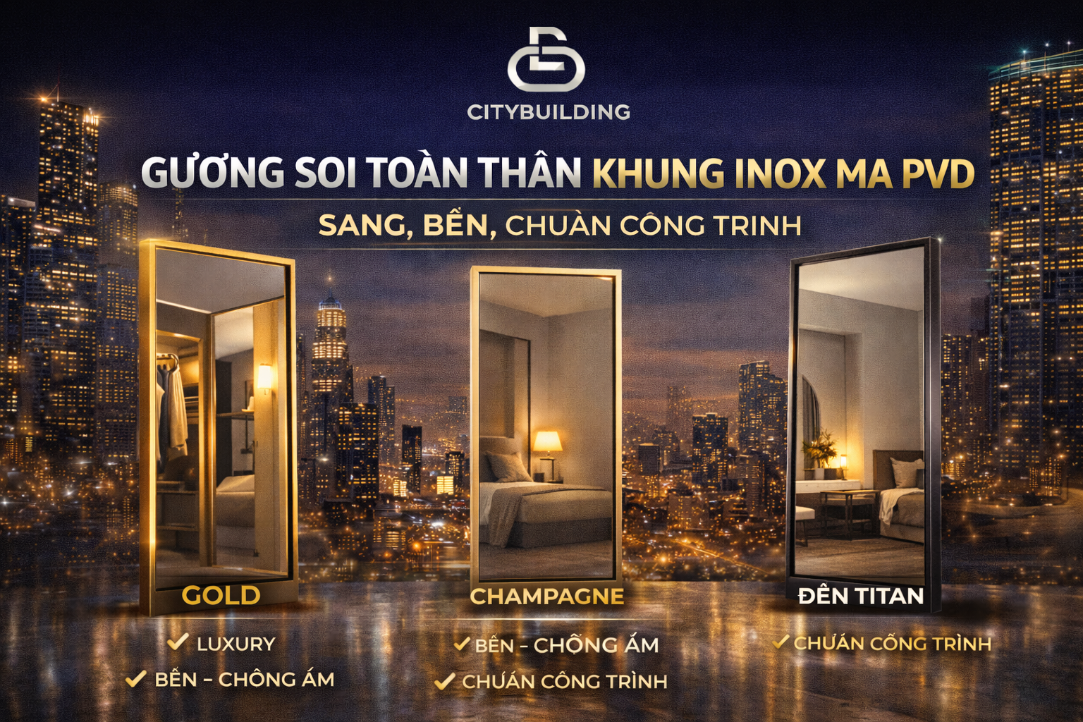 💎 Gương soi toàn thân khung inox mạ PVD cao cấp: sang trọng, bền màu, chống ẩm, phù hợp phòng ngủ, phòng thay đồ, shop thời trang và công trình. Tư vấn chọn màu PVD, kích thước 700x1700, 800x1800, gương treo tường hoặc gương đứng. Citybuilding sản xuất theo yêu cầu, lắp đặt Hà Nội & TP.HCM.