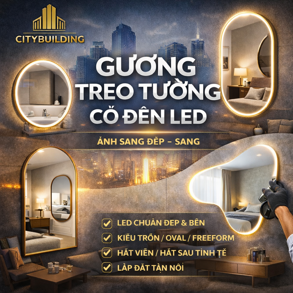 💎 Citybuilding chuyên sản xuất gương treo tường có đèn LED: LED hắt viền/hắt sau, gương tròn/oval/vòm/freeform, khung inox mạ PVD, ánh sáng đẹp – bền – an toàn. Tư vấn mẫu – báo giá nhanh – lắp đặt tận nơi TP.HCM & Hà Nội. Hotline 0932208189.