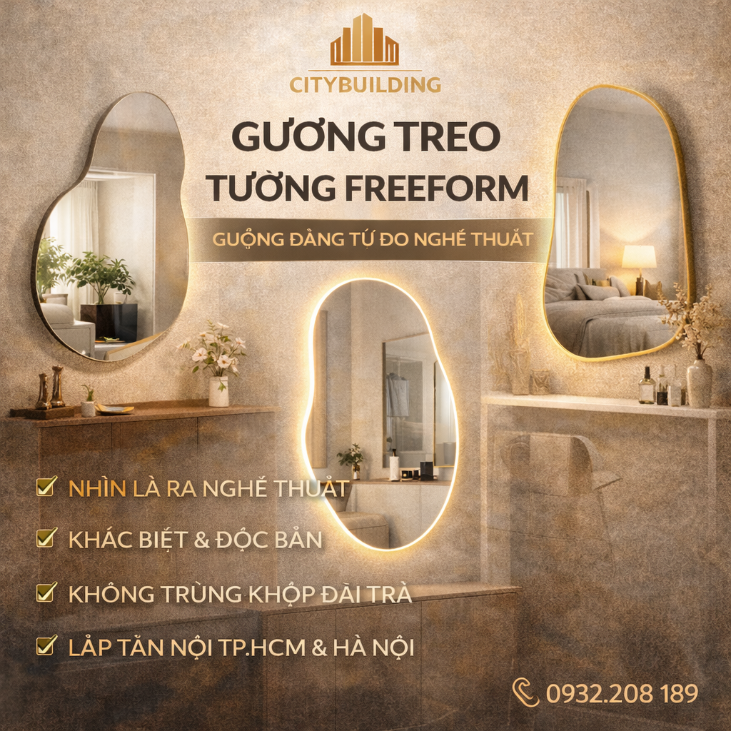 💎 Citybuilding chuyên sản xuất gương treo tường freeform (irregular): gương dáng tự do decor phòng khách, phòng ngủ, sảnh, showroom; tùy chỉnh form – kích thước – LED – khung inox mạ PVD. Hoàn thiện cao cấp – thi công an toàn TP.HCM & Hà Nội. Hotline 0932208189.