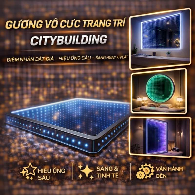 💎 Citybuilding chuyên sản xuất gương vô cực trang trí theo yêu cầu: hiệu ứng sâu – ánh sáng đều – không chói, hoàn thiện cao cấp. Phù hợp decor phòng khách, phòng ngủ, showroom, spa, studio, dự án concept hiện đại.