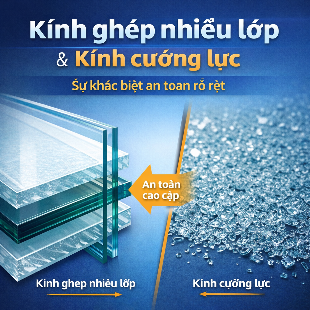 🔹 Kính ghép nhiều lớp là giải pháp kính an toàn cao cấp, khác biệt hoàn toàn với kính cường lực ở cấu tạo, cơ chế vỡ và mức độ bảo vệ con người.