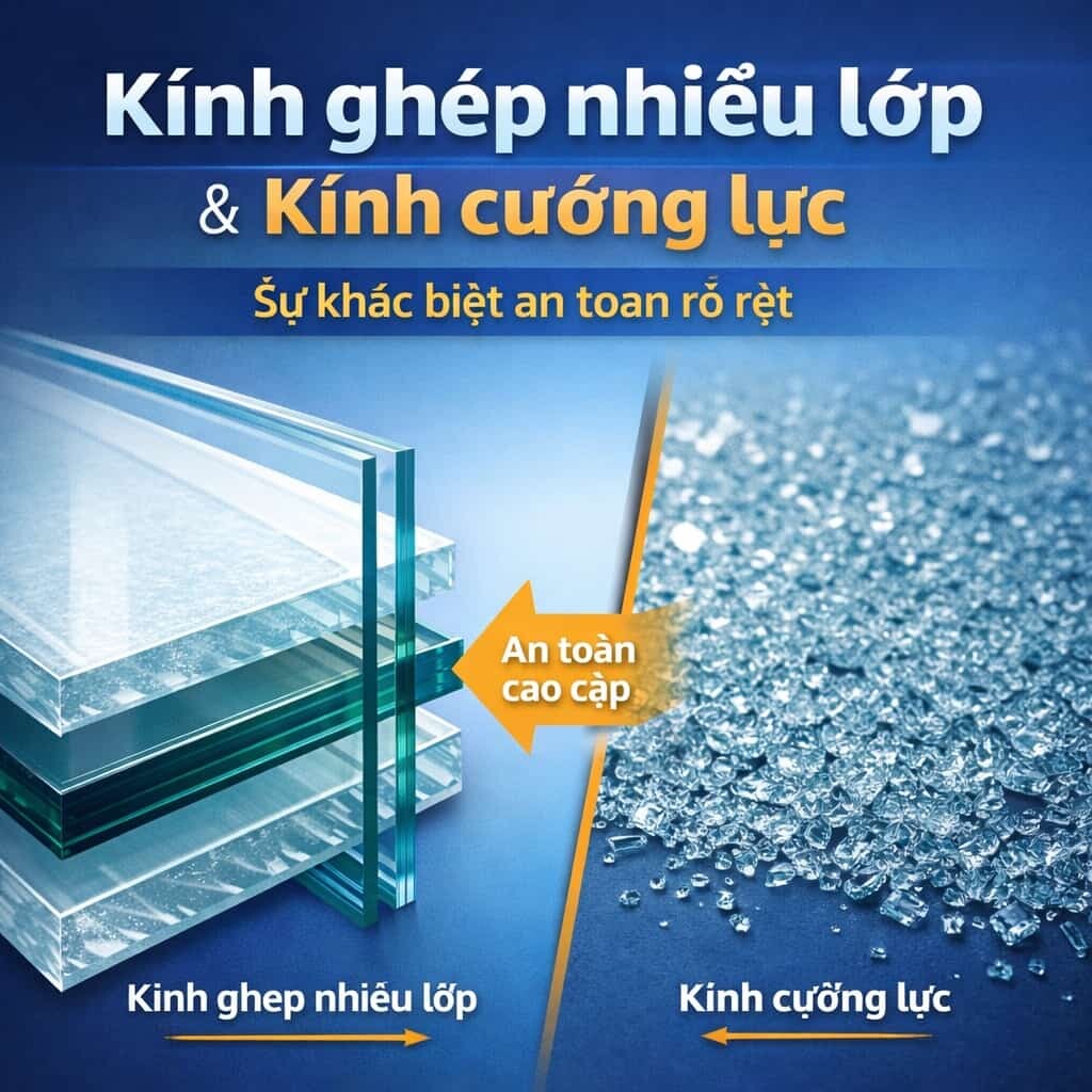 8️⃣ SO SÁNH KÍNH GHÉP NHIỀU LỚP VÀ KÍNH CƯỜNG LỰC (CHUẨN KỸ THUẬT)