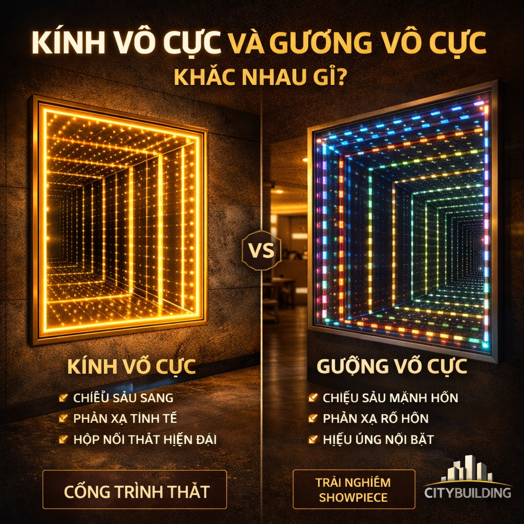 💎 Kính vô cực và gương vô cực khác nhau ở cấu tạo, hiệu ứng phản xạ, ứng dụng và mức độ “chiều sâu”. Citybuilding hướng dẫn phân biệt chuẩn, ưu – nhược điểm từng loại và cách chọn đúng cho showroom, trần, tường, thang máy.