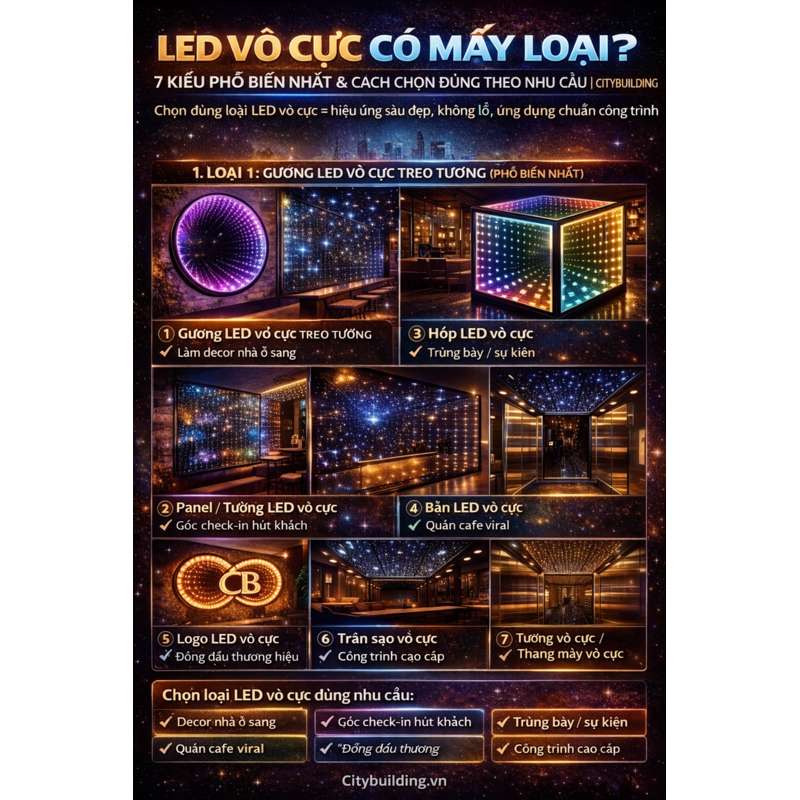 🔗 Xem bài tổng quát: LED vô cực là gì? Ứng dụng – cấu tạo – giá – mẫu đẹp | Citybuilding