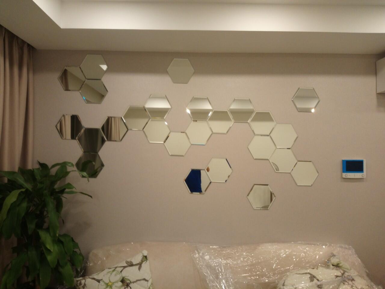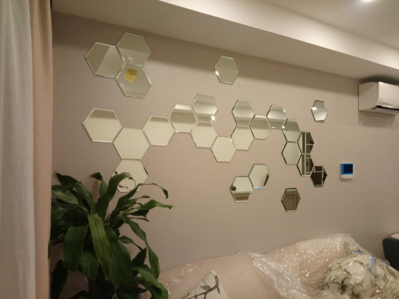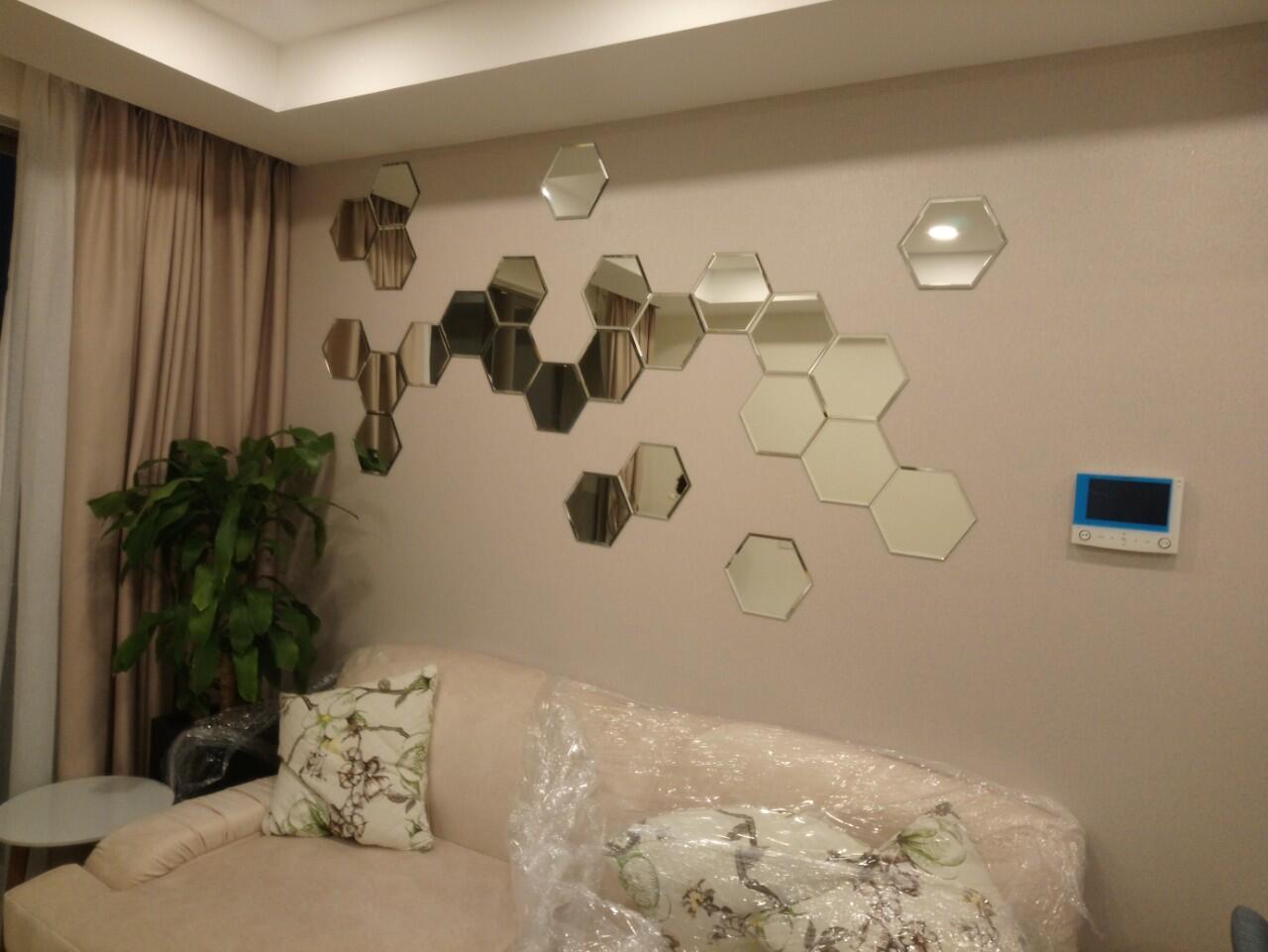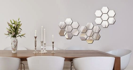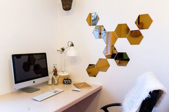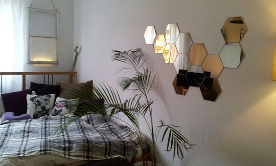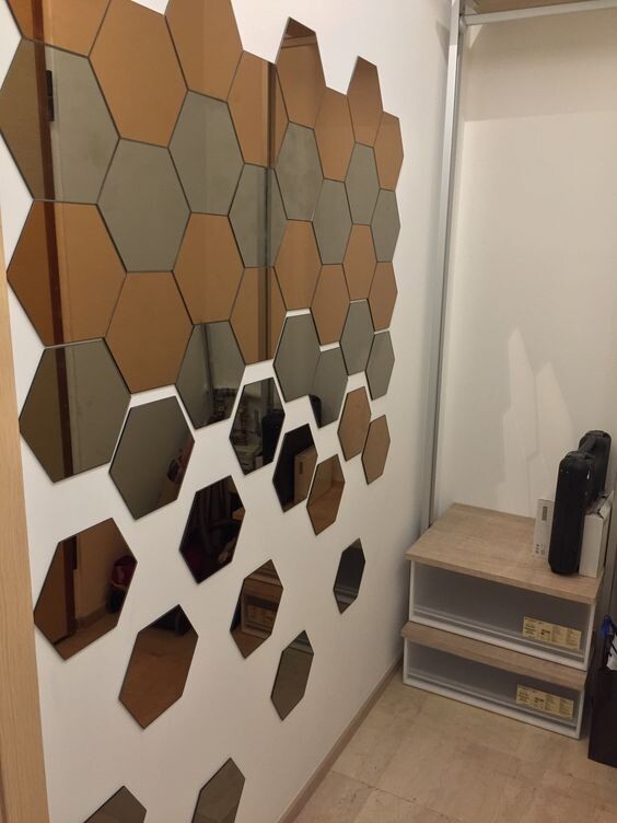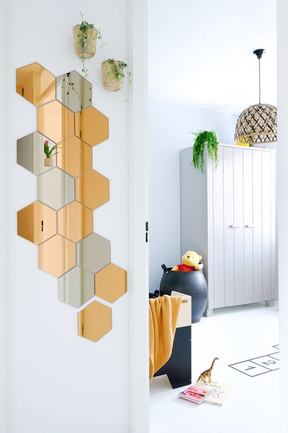 Một tập hợp khối gương lục lăng như tổ ong trang trí trên tường sẽ tạo ra tổ hợp trang trí đẹp mắt. Ngoài hình dáng đa dạng của gương, bạn còn có thể "lợi dụng" những món đồ được phản chiếu lại trong gương để tạo ra điểm nhấn độc đáo cho bức tường.