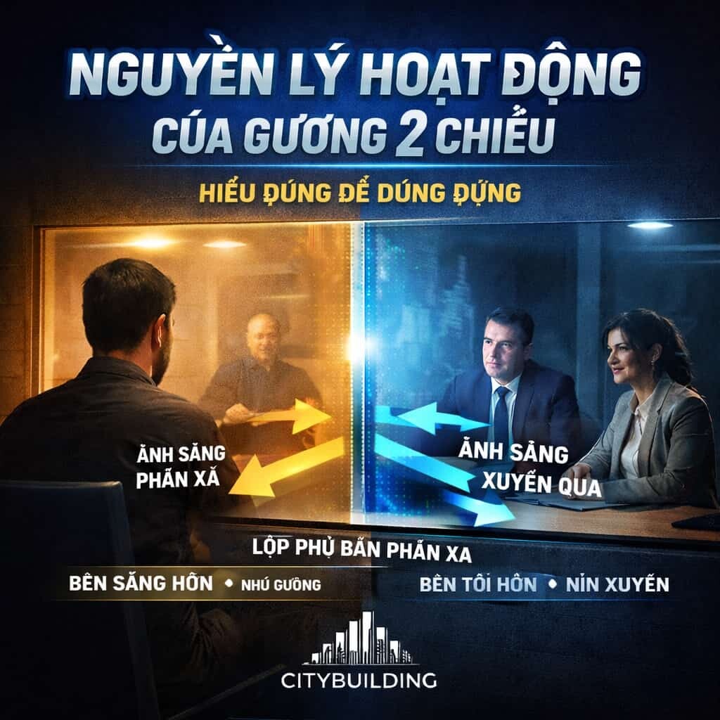 👉 Gương 2 chiều không tự chọn bên nào nhìn – bên nào bị nhìn. Ánh sáng quyết định tất cả.