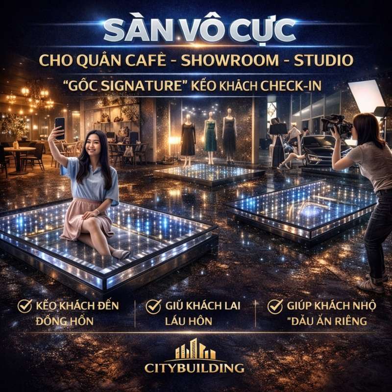 💎 Sàn vô cực giúp quán cafe, showroom và studio tạo điểm nhấn thị giác sang – sâu – hút người chụp ảnh. Bài viết gợi ý cách chọn diện tích, vị trí đặt sàn vô cực, cấu hình phù hợp lưu lượng khách và cách Citybuilding thi công để đẹp bền, không rung, dễ vệ sinh.