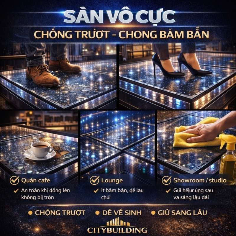 💎 Sàn vô cực đẹp phải đi kèm an toàn: chống trượt, dễ vệ sinh và giữ hiệu ứng lâu. Bài viết giúp bạn chọn bề mặt kính phù hợp cho quán cafe, showroom, lounge, studio; tránh các lỗi dễ trơn – dễ bám bẩn và cách Citybuilding xử lý để sàn vô cực luôn sạch, bền, không xuống hiệu ứng.