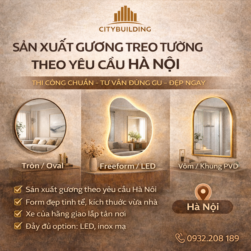 💎 Citybuilding nhận sản xuất gương treo tường theo yêu cầu tại Hà Nội: gương tròn, oval, vòm cong, freeform, gương LED, khung inox mạ PVD. Hoàn thiện cao cấp – thi công an toàn – lắp đặt tận nơi. Hotline 0932208189.