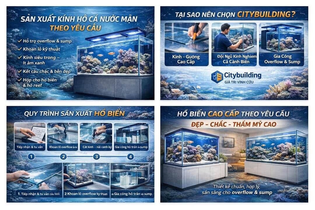 Citybuilding nhận sản xuất kính hồ cá nước mặn theo yêu cầu với giải pháp gia công chuẩn kích thước, tính đúng kết cấu, hỗ trợ thiết kế overflow, chừa hệ sump, tối ưu thẩm mỹ và độ bền cho hồ biển, hồ reef và hồ trưng bày cao cấp.