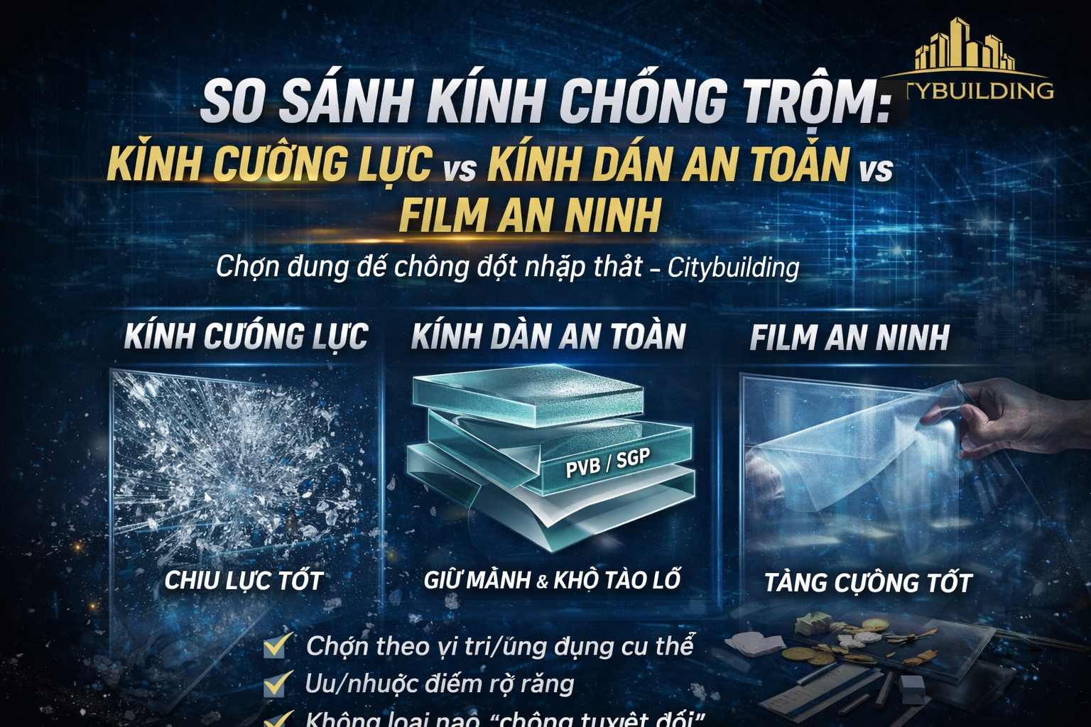 2) So sánh 3 giải pháp kính chống trộm: kính cường lực, kính dán an toàn PVB/SGP và film an ninh. Citybuilding phân tích ưu/nhược, mức chống phá, khả năng giữ mảnh, và gợi ý chọn theo cửa sổ – cửa đi – mặt tiền.