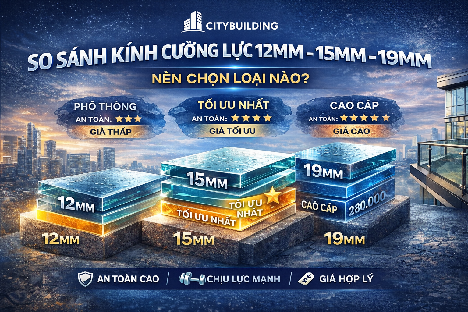 💎 So sánh kính cường lực 12mm, 15mm và 19mm về độ an toàn, chịu lực, giá thành và ứng dụng thực tế. Giải đáp nên chọn loại nào cho lan can, cầu thang, công trình.