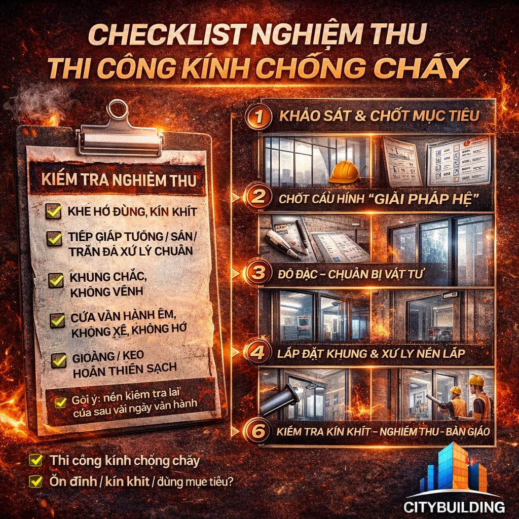 🔹 Thi công kính chống cháy: Quy trình lắp đặt, checklist nghiệm thu, hồ sơ bàn giao chuẩn hệ | Citybuilding