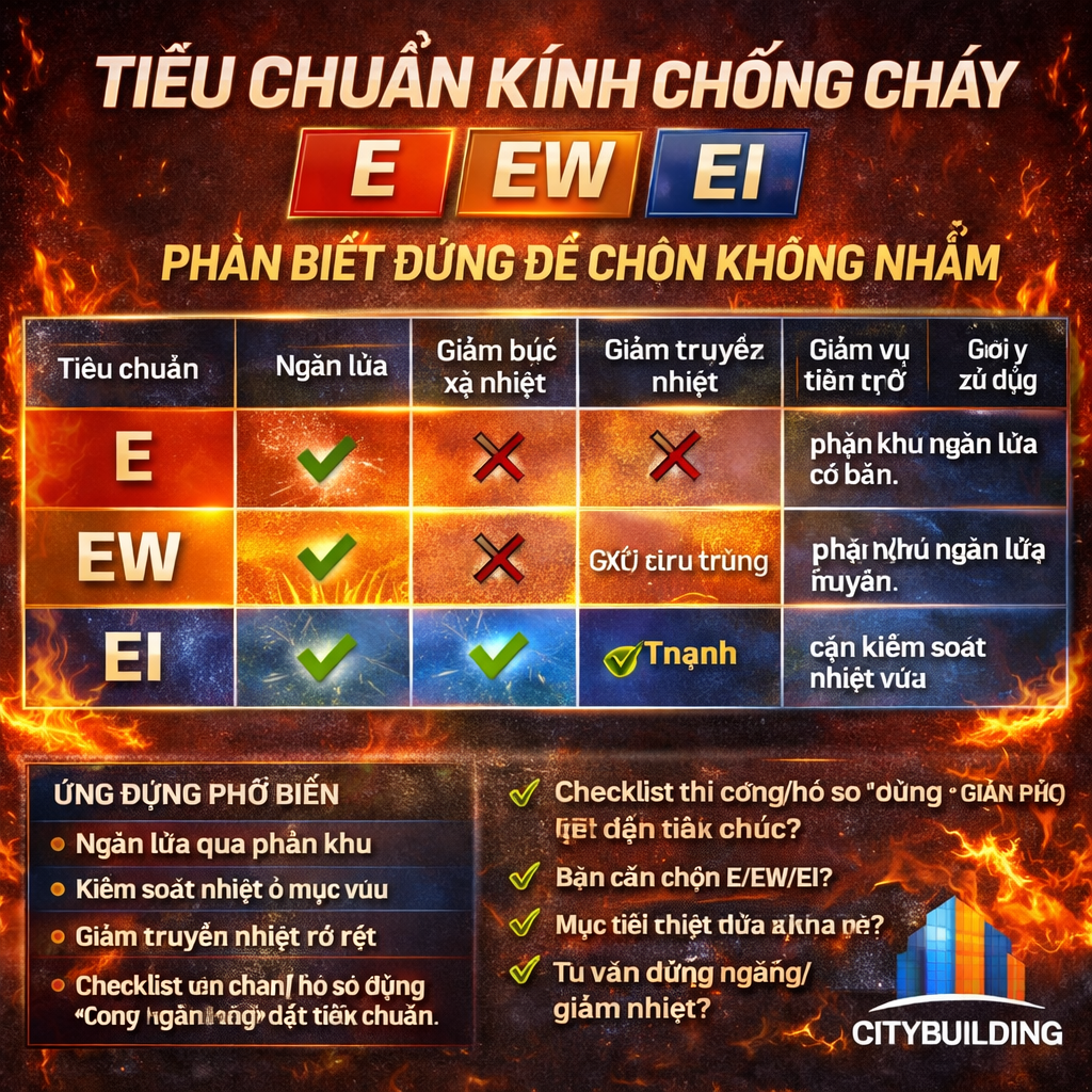 💎 Citybuilding giải thích tiêu chuẩn kính chống cháy E/EW/EI theo cách dễ hiểu: E ngăn lửa, EW giảm bức xạ nhiệt, EI cách nhiệt/giảm truyền nhiệt. Có bảng so sánh nhanh, lỗi chọn sai phổ biến, hướng dẫn chọn theo khu vực cửa – vách, kèm checklist nghiệm thu theo tư duy “giải pháp hệ”.