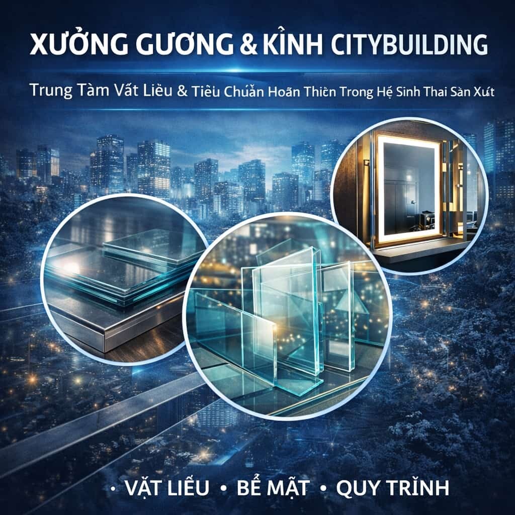 Xưởng Gương & Kính Citybuilding được phân chia năng lực theo vai trò vật liệu và ứng dụng, không theo danh mục bán hàng.